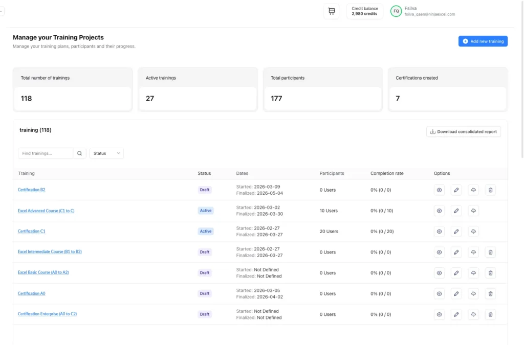 It is the space within Ninja Excel that allows training managers to activate course packages, enroll participants, and track progress from a single place. It is designed to integrate Excel training into the standard HR management workflow.
